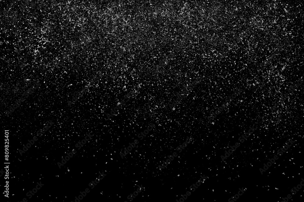Freeze motion of white powder coming down, isolated on black, dark background. Abstract design of falling dust cloud. Particles cloud screen saver, wallpaper with copy space. Rain, snow fall concept