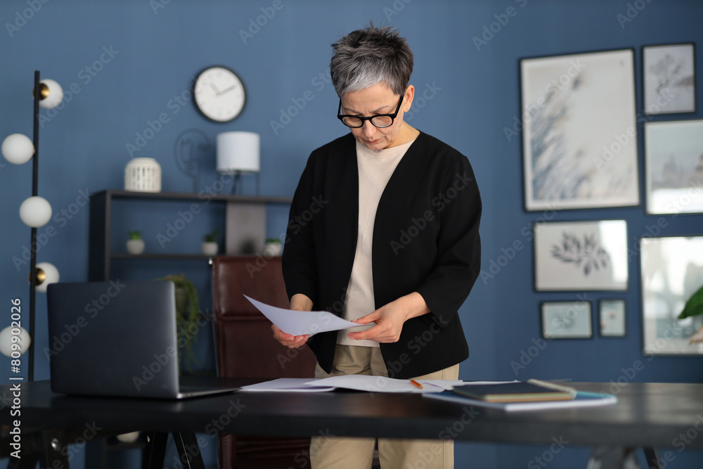 A businesswoman manages paperwork in a corporate office, embodying professionalism and confidence.