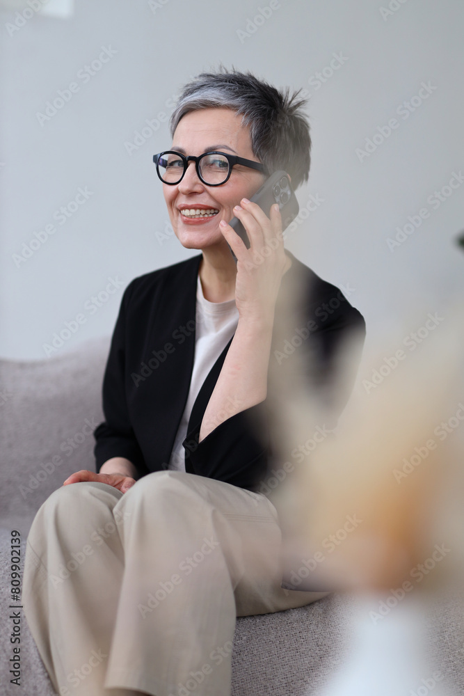 A mature businesswoman engages in a cheerful conversation on her mobile, blending professionalism with modern communication.