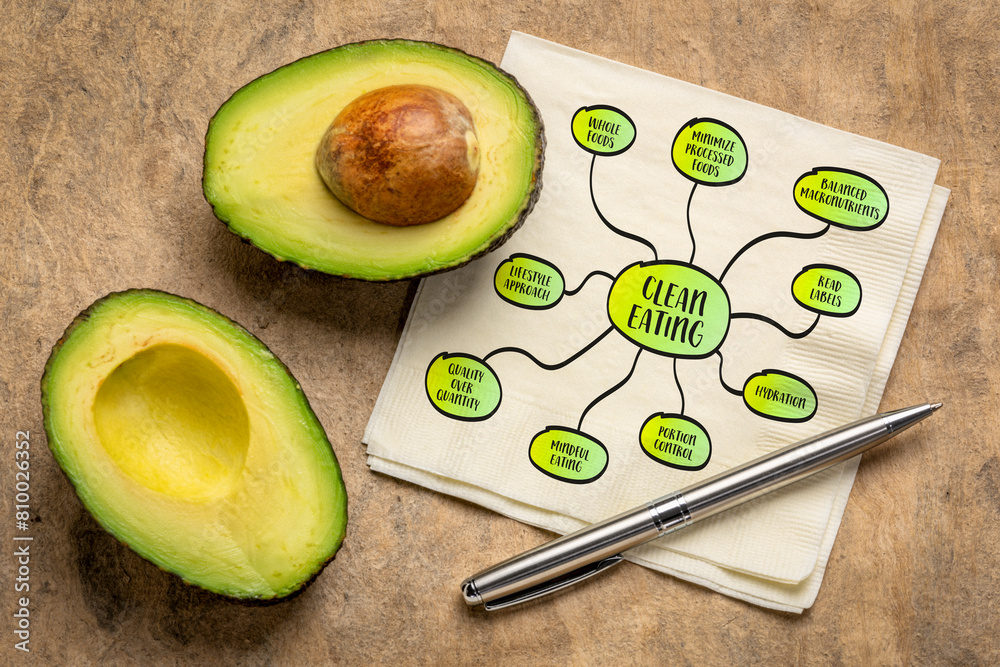 Clean eating, a dietary approach focused on consuming whole, unprocessed foods while minimizing or avoiding processed foods, mind map infographics sketch on a napkin with avocado