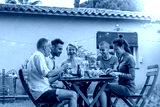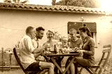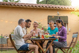 Multiethnic family eating happy smiling and laughing in the backyard at home. High quality photo