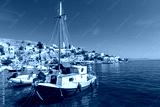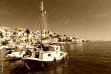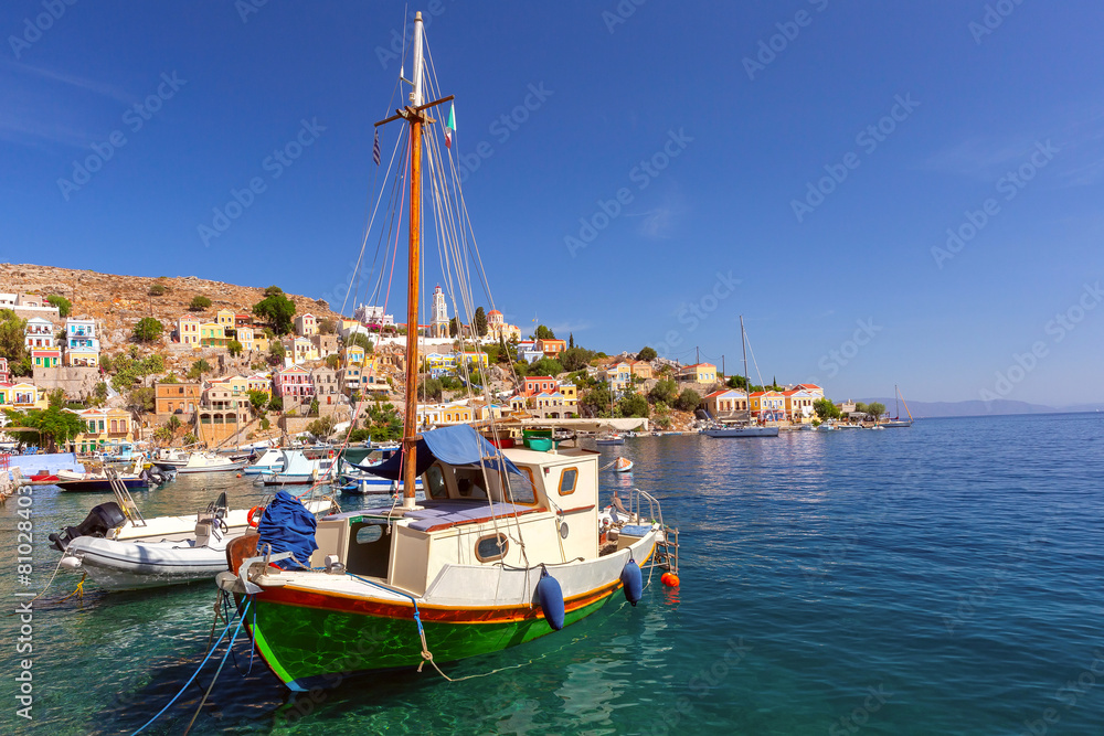 Serene harbor view with a traditional fishing boat on Symi Island, Greece