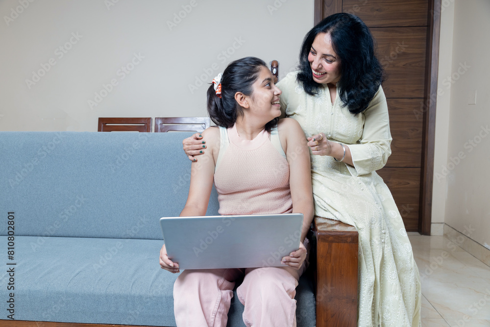 Indian teen daughter pointing towards laptop and showing mother laptop screen , Indian mother and daughter together sitting on sofa and looking towards the laptop