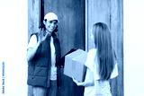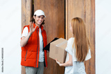 Friendly Delivery Man Waving At Customer While Handing Over Parcel In Doorway. Perfect For Topics On Home Delivery Service, Online Shopping, And Customer Satisfaction.