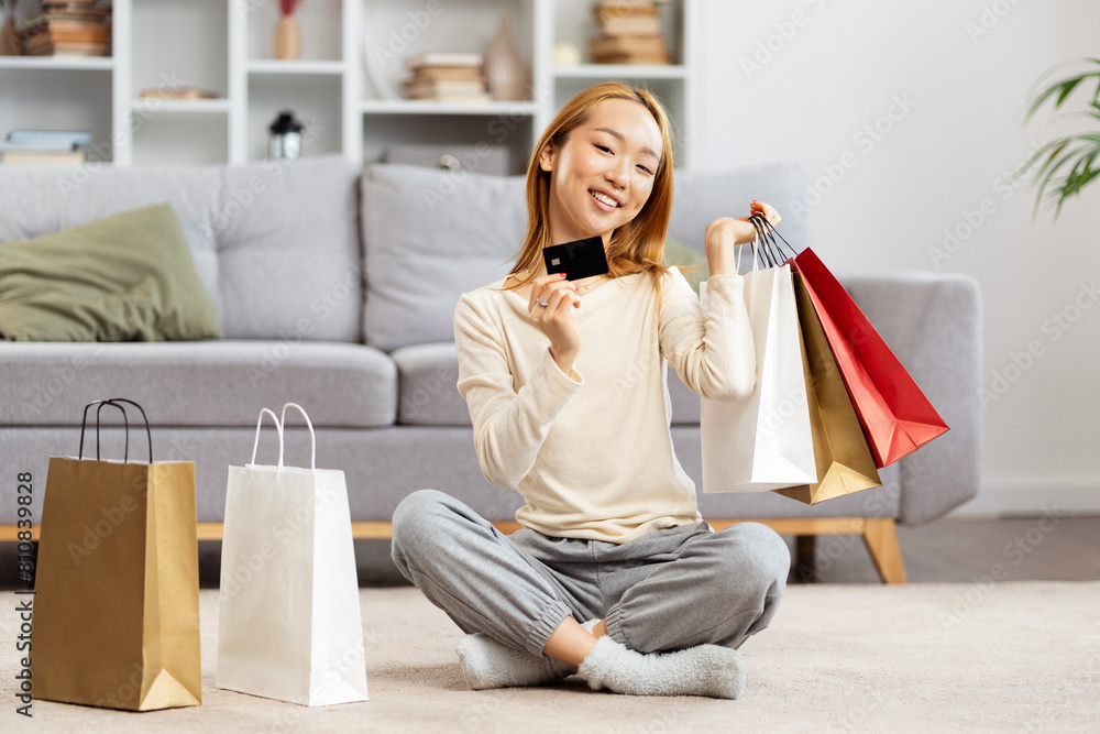 Happy Young Woman Enjoying Online Shopping At Home, Smiling Female Holding Credit Card And Colorful Shopping Bags, E-commerce Concept