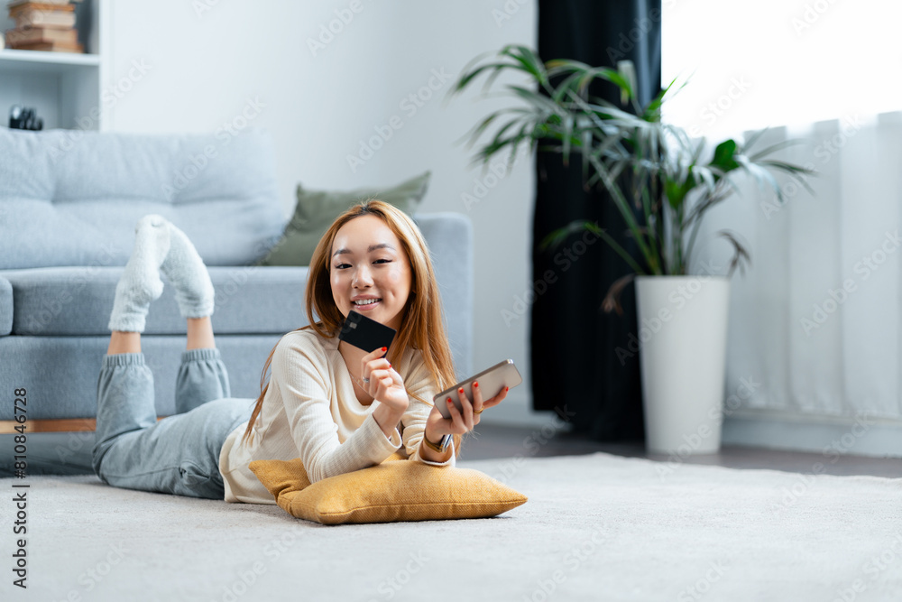 Young Woman Enjoying Online Shopping At Home, Lies On Floor Showing Credit Card While Using Smartphone. Comfort, Leisure, Technology Concept.