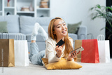 Happy Young Woman Shopping Online At Home, Holding Credit Card And Mobile Phone With Shopping Bags Around. Concept Of E-commerce, Online Shopping, Consumerism.