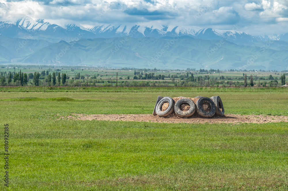 Green field and gate (tai-kazan) for playing traditional Asian horse games alaman, kok-boru, ulak.