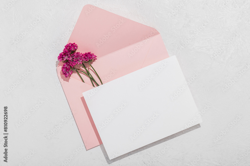 Pink envelope with a bouquet of pink Armeria.Greeting card.