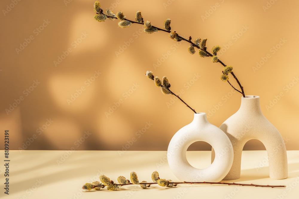 Two modern ceramic vases with willow flowers. Spring bright background.