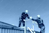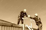 Two construction workers wearing safety gear climb up a ladder to the roof of a building