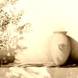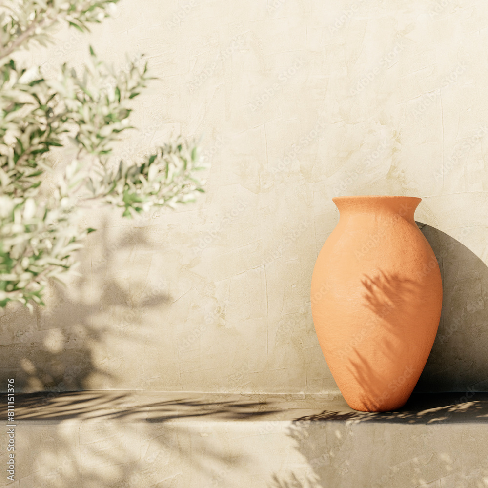 Olive tree shadow on beige rustic wall with clay pot. Summer mediterranean traditional home architecture design, neutral aesthetic. Texture paint plaster facade mockup background.