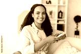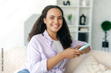 Gorgeous brazilian or hispanic curly stylish woman, sitting on a sofa at home in living room, using smartphone, messaging on social media, texting with friends, browsing information, smiles at camera