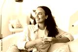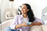 Gorgeous brazilian or hispanic curly woman, sitting on a sofa at home in living room, using smartphone, messaging on social media, texting with friends, browsing information, looking away, smiles