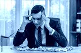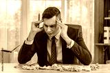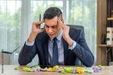 A businessman is sitting at his desk, holding his head in his hands. He is surrounded by crumpled paper. He looks stressed and frustrated.