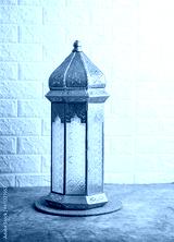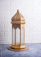 Eid Mubarak and Ramadan Kareem concept background, Golden lantern lamp on the table with copy space for greeting text