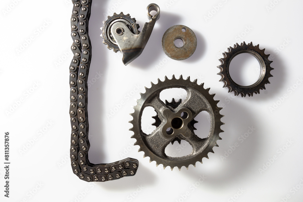 gears of the valve timing mechanism of internal combustion engines, on a black background,close-up