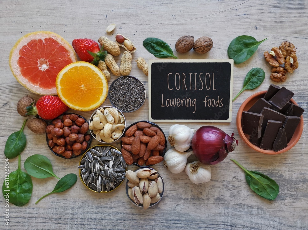 Foods to naturally lower cortisol levels, reduce stress and anxiety. Healthy foods to lower cortisol. Foods to decrease cortisol and stress levels. Cortisol lowering foods, healthy diet concept.