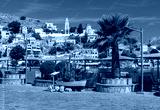 Hillside view of the colorful buildings and busy harbor on Symi Island, Greece.
