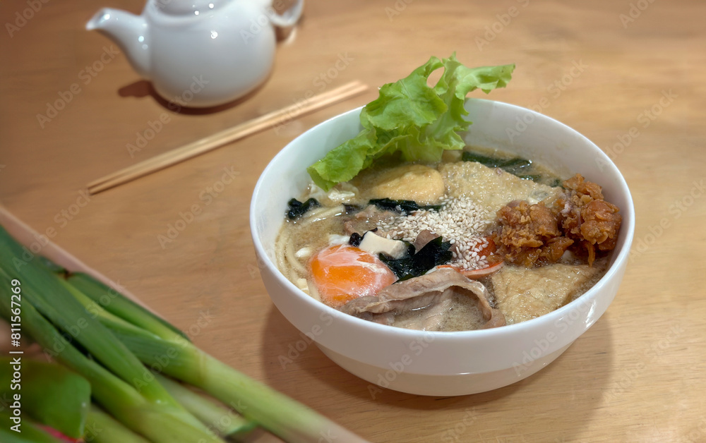 home cusine asian style with mix vegetable herb pork chicken tofu serve with soup