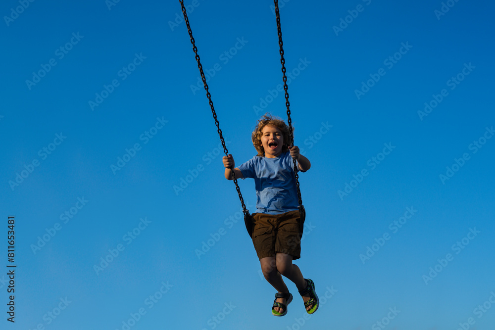 Child swinging on chain swing on city kids playground. Swing ride. Cute child having fun on a swing on summer sky background. Blonde little boy swings at kid playground. Child swinging high.