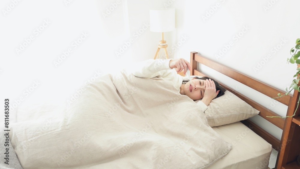 寝ながら体温計で熱を測る女性