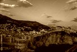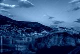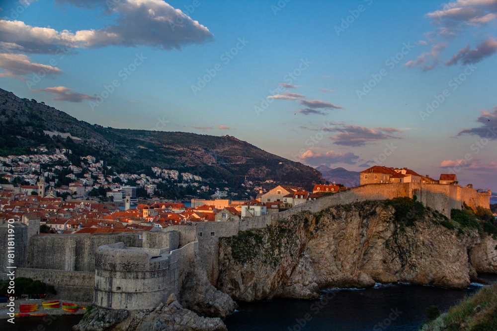 Rocky cliff with the fortress wall of a medieval castle and red tiles of houses on the Mediterranean coast in the old part of Dubrovnik, Croatia. Game of Thrones filming location