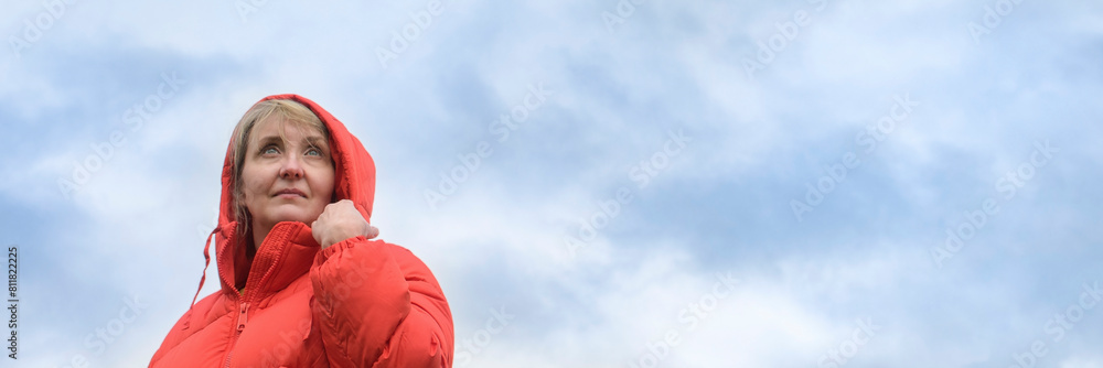 A blonde woman in an autumn jacket with a hood against the background of a beautiful sky with clouds. Woman in a red jacket and the sky in bad weather