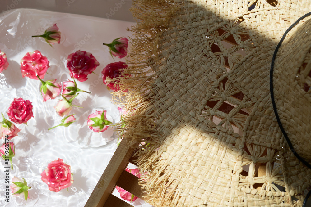 Relaxing Spa Day with Floral Bath and Straw Hat