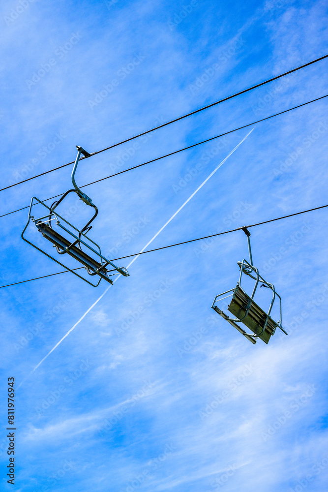 Two empty ski lift chairs hanging from the cables against the blue cloudy sky