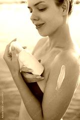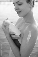 Beautiful Woman in Bikini Applying Sun Cream on Tanned Shoulder. Sun Protection. Skin and Body Care. Girl Using Sunscreen to Skin. Portrait Of Female Holding Suntan Lotion and Moisturizing Sunblock