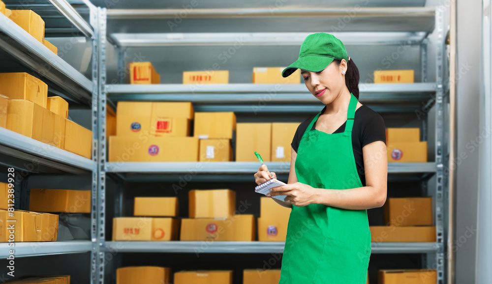 Asian woman servicer checking stock of package in storeage room with note in apron wear for business
