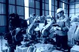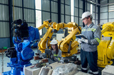 Engineer inspection control a robot arm welding machine with a remote system in an industrial factory, technician worker check for repair maintenance electronic operation