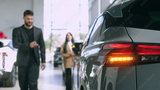 Stylish female car dealer serving a client in a car showroom. Automotive business, trade, dealership.
