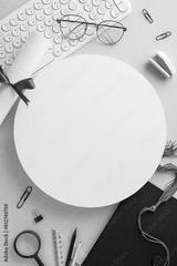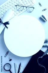 Online learning achievement concept. Vertical top view of keyboard, graduation cap, diploma, study materials, ruler, pencils, glasses on a blue background with blank circle for text or advertisement