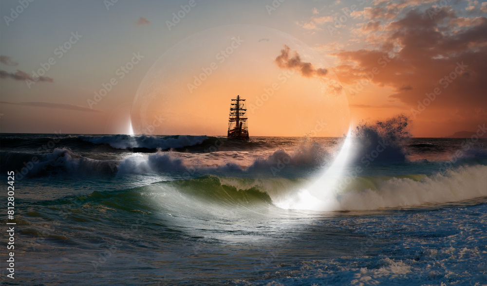 Sailing old ship in a storm sea with crescent moon stormy clouds in the background