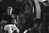 Sportsman working out on rowing machine at crossfit gym
