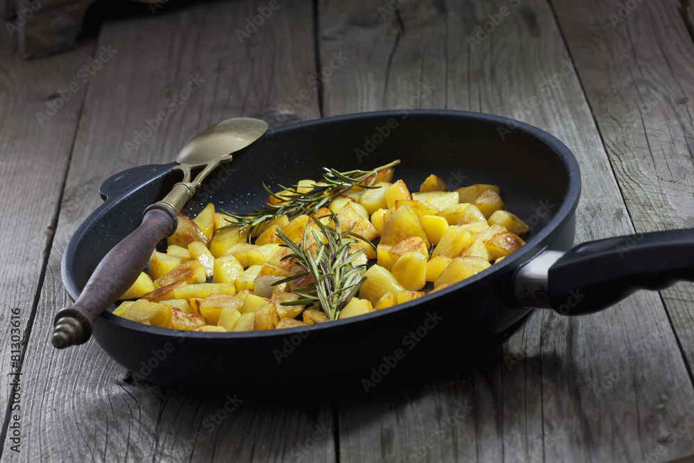 Röstkartoffeln in Gusseisen Pfanne, Thymian, alter Löffel