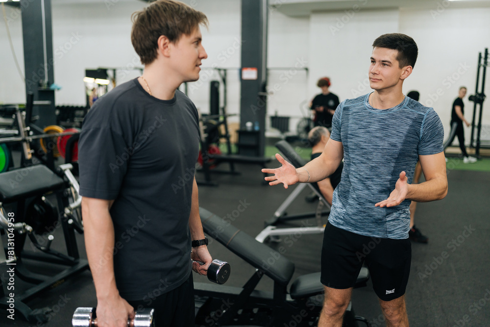 Side view of personal male trainer helping young beginner sportsman and discussing together in gym. Fitness coach male discussing training, workout plan and progress in health and wellness facility.