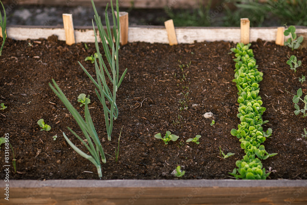Onions and greens growing in raised garden bed close up. Growing vegetables and salad in urban organic garden. Homestead lifestyle