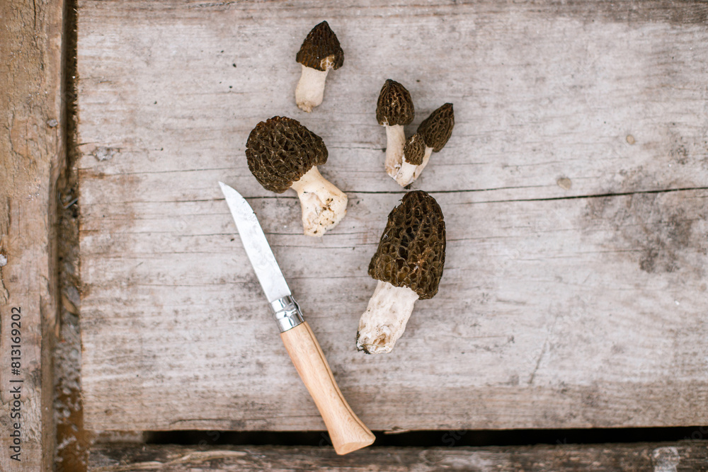 Morchella mushrooms and knife on wooden background flat lay. True morels. Harvesting Morchella esculenta, copy space. Fungi delicacy, delicious edible mushrooms