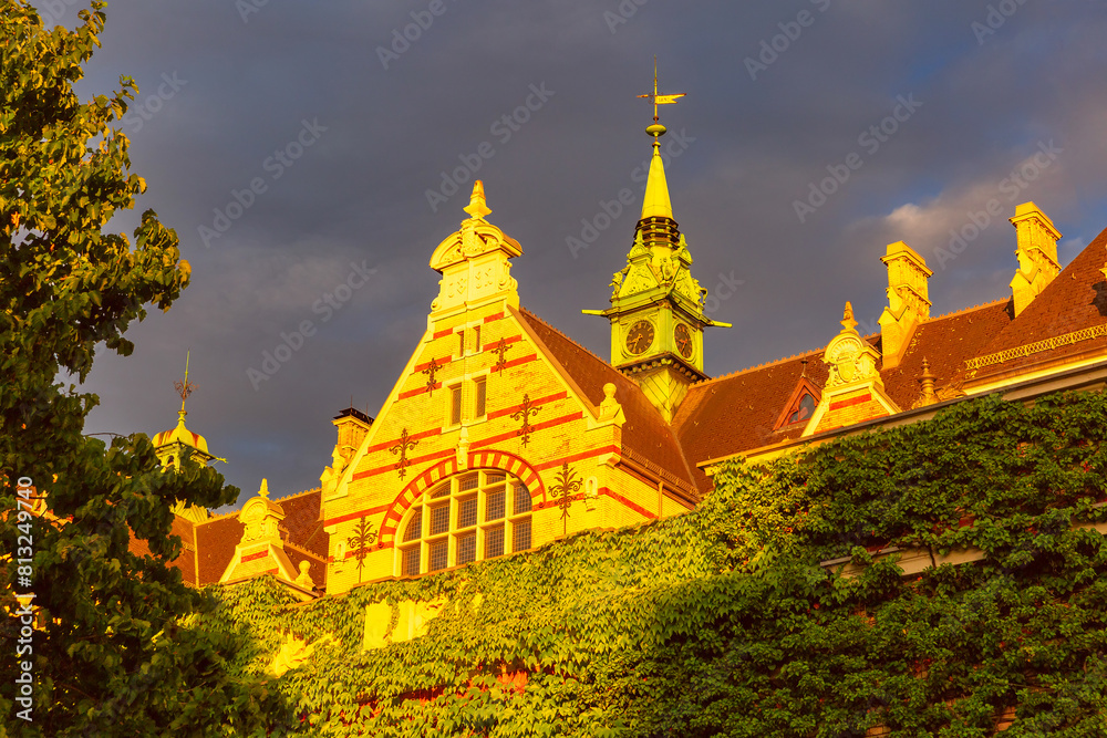 Sunny facade of swiss house in Old Town of Zurich, Switzerland at sunset