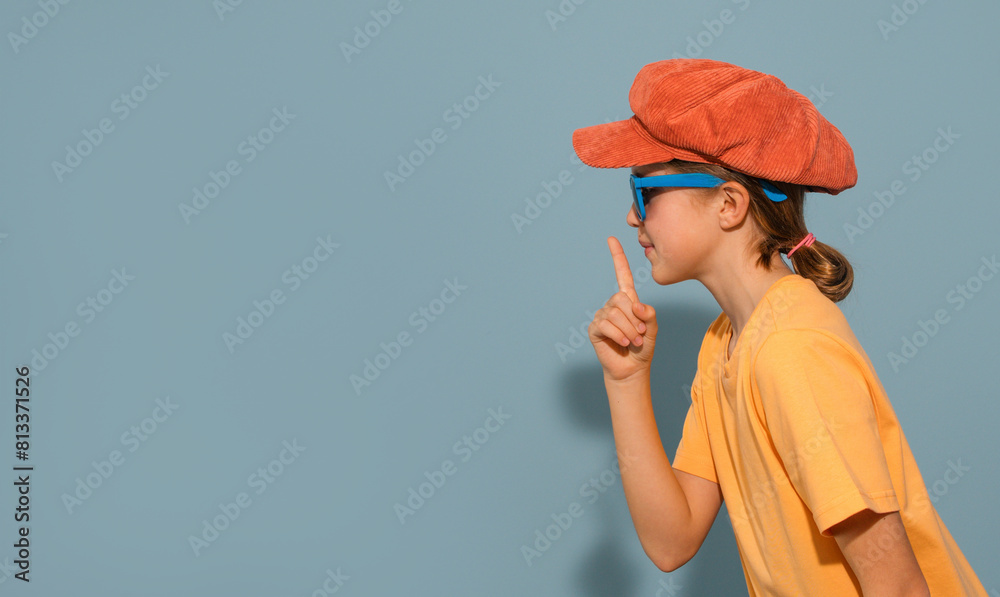 A girl in a red hat and orange shirt is pointing to her mouth and making a "shh" gesture. Copy space