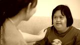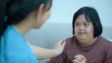 A patient with Down syndrome receives encouragement from an Asian female doctor at home. Ideas for helping disabled patients.