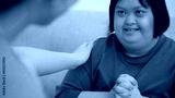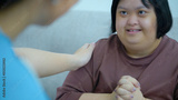 A patient with Down syndrome receives encouragement from an Asian female doctor at home. Ideas for helping disabled patients.