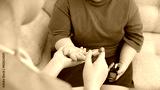 Asian female nurse uses a diabetes test device for a woman with Down syndrome at home.