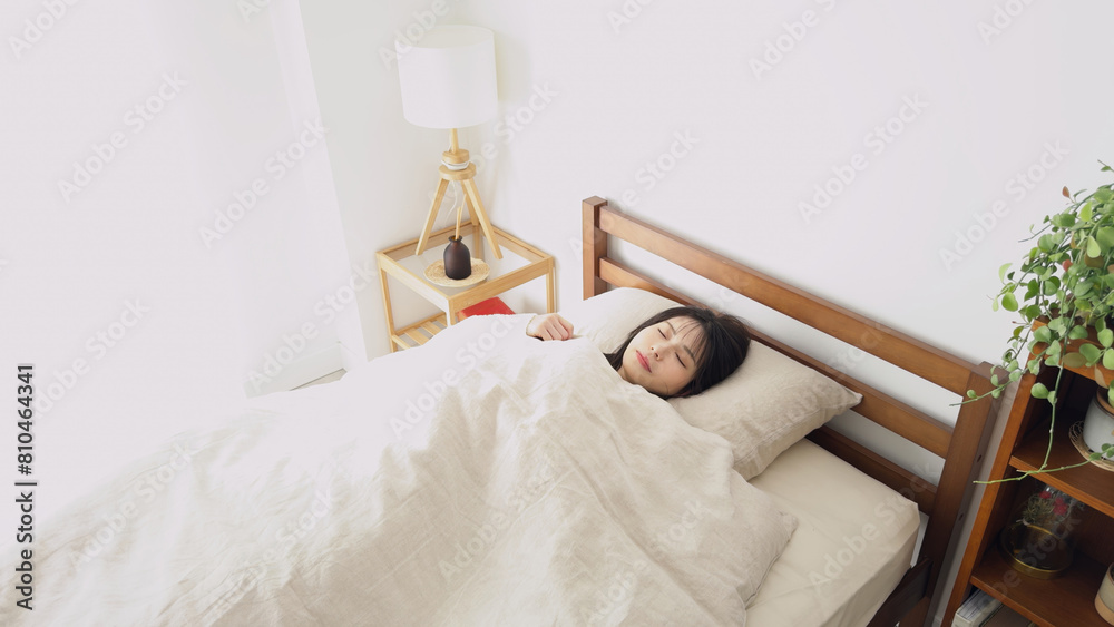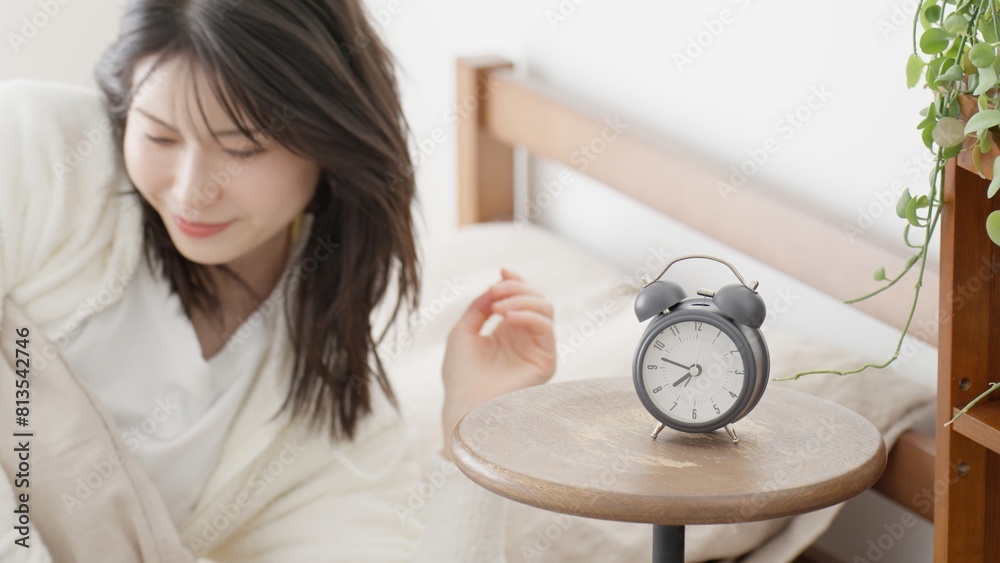 朝ベッドから起きる女性