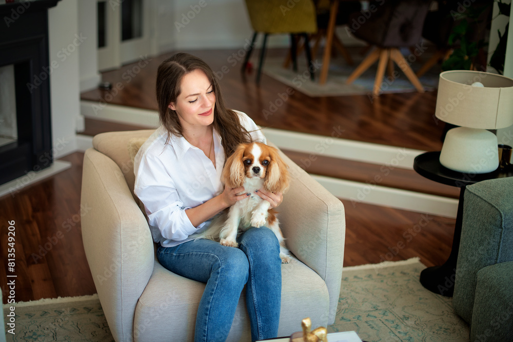 Portrait of a brunette haired woman relaxing in an armchair at home