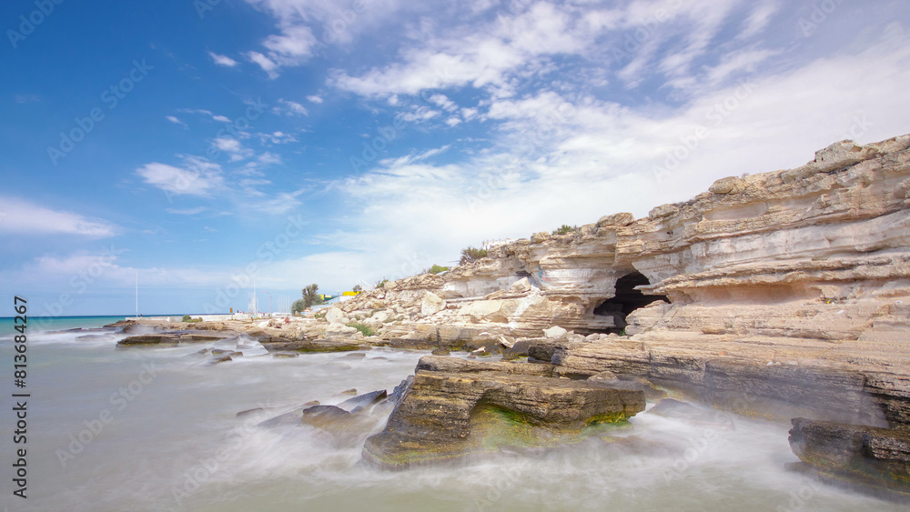 Seascape from the deserted shore to the caspian sea with blue sky and roaring waves timelapse