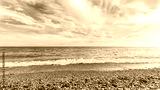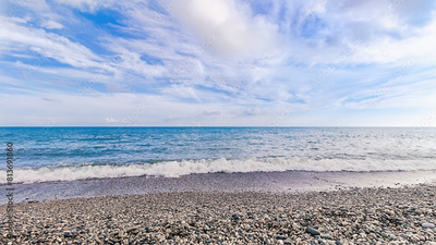 Summer sea beach landscape nature background wallpaper. Clear blue sea water on pebble beach. Summer vacation in Abkhazia, New Athos.